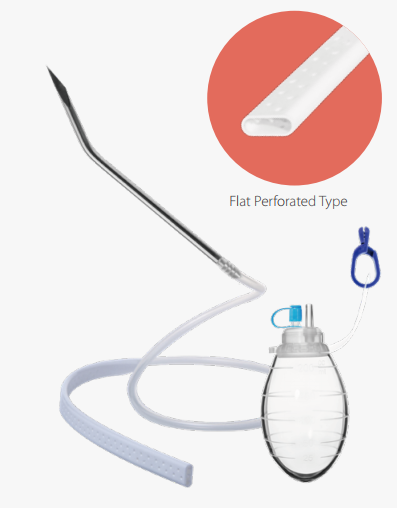 Das System umfasst einen flach perforierten Drainageschlauch (7 mm × 20 cm) sowie einen Evakuator mit 150 ml Fassungsvermögen, der eine kontrollierte und kontinuierliche Sekretableitung ermöglicht. Je nach Ausführung ist das System mit Edelstahl-Trokar erhältlich, um eine präzise und sichere Platzierung zu unterstützen.